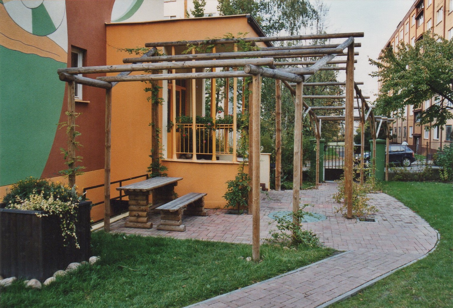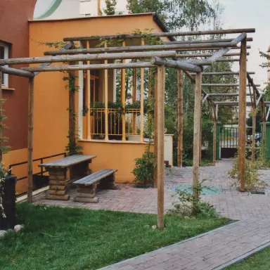 - vstupní pergola s posezením – osázena popínavými rostlinami,