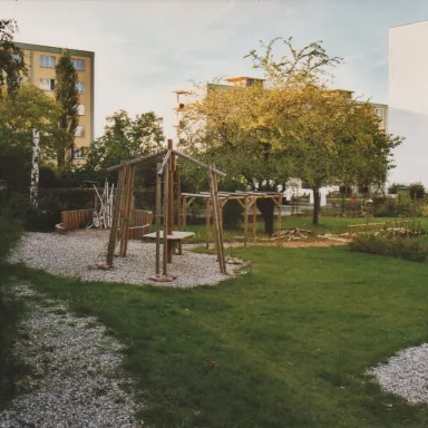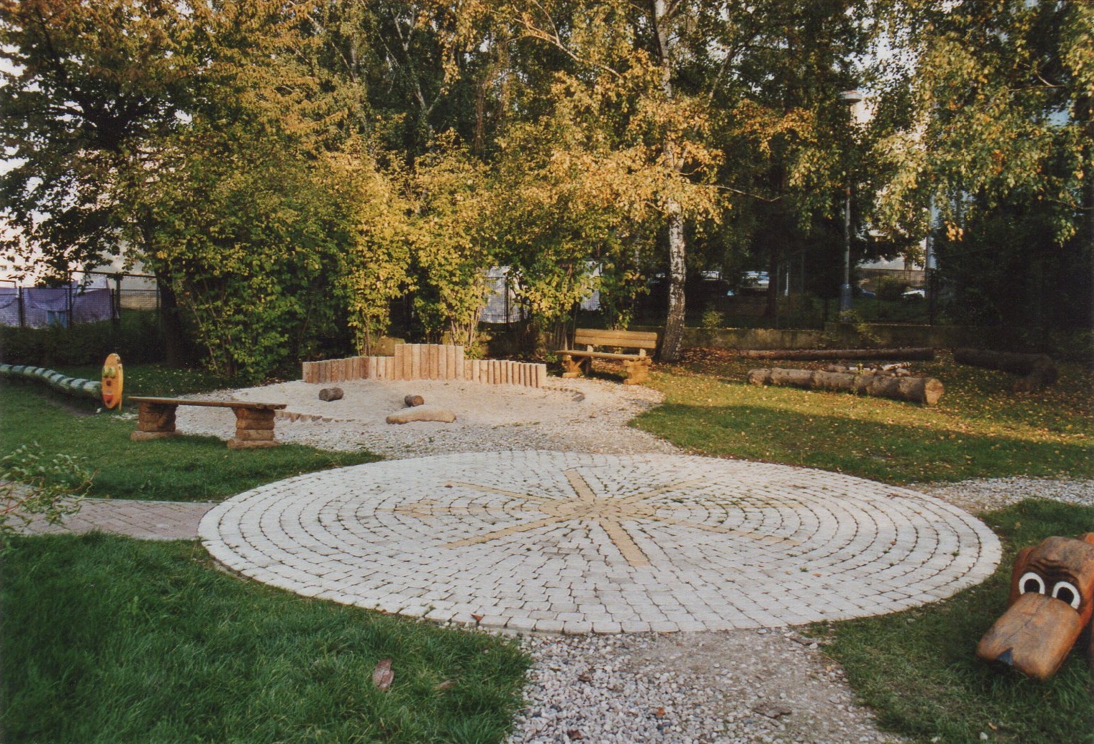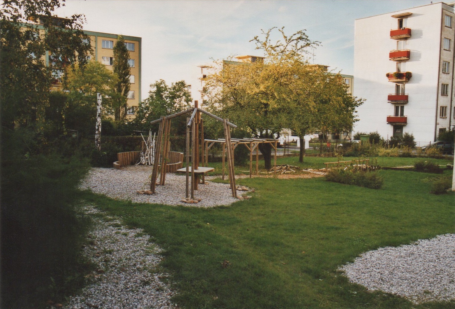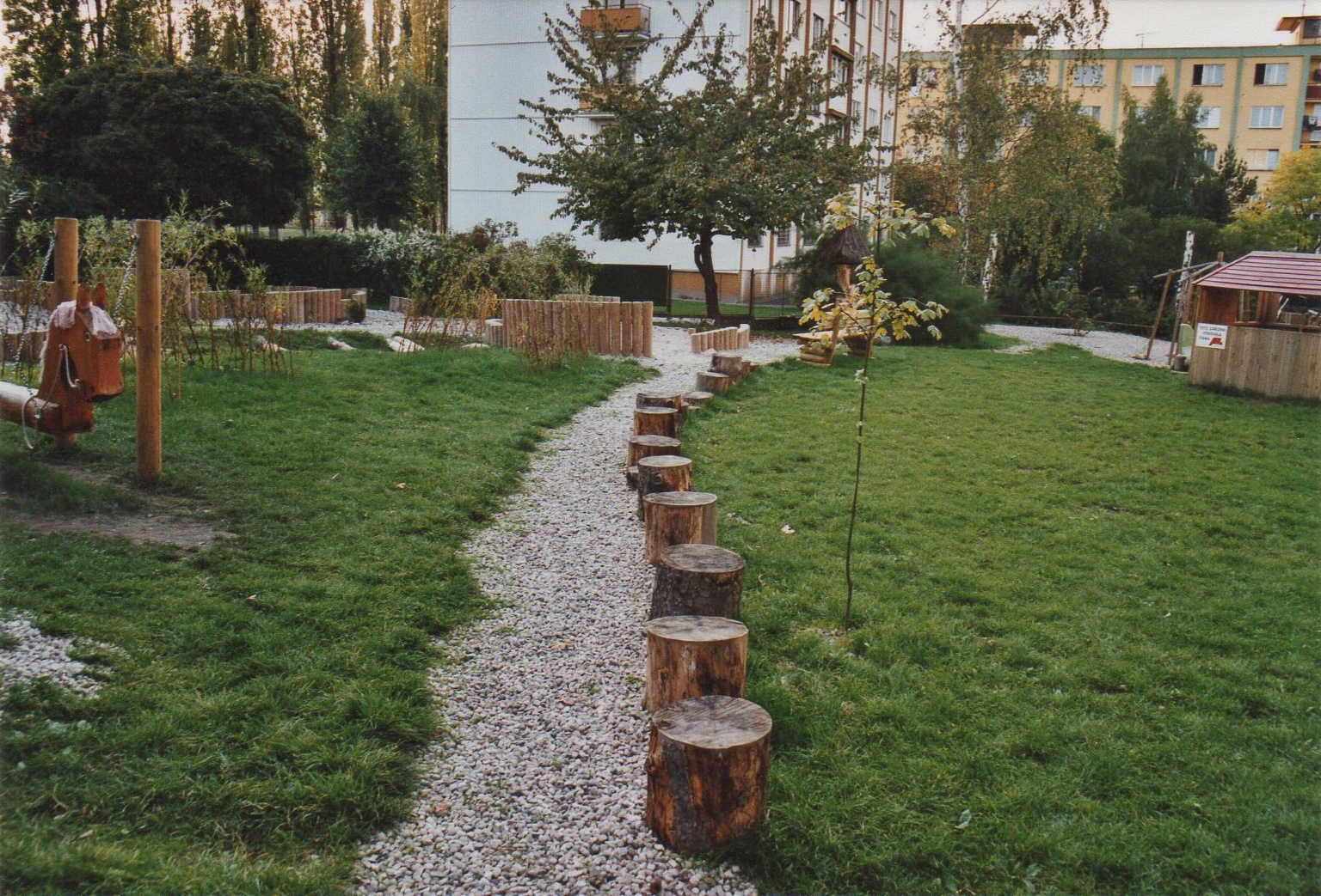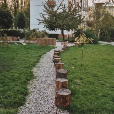- tzv. suchý potok - jeho součástí jsou pískoviště, je volně propojen po obvodu celé zahrady, přes potok položeno několik klád, dále jsou zde umístěny balvany dotvářející představu koryta vodního toku, navržena i výsadba nových stromů,